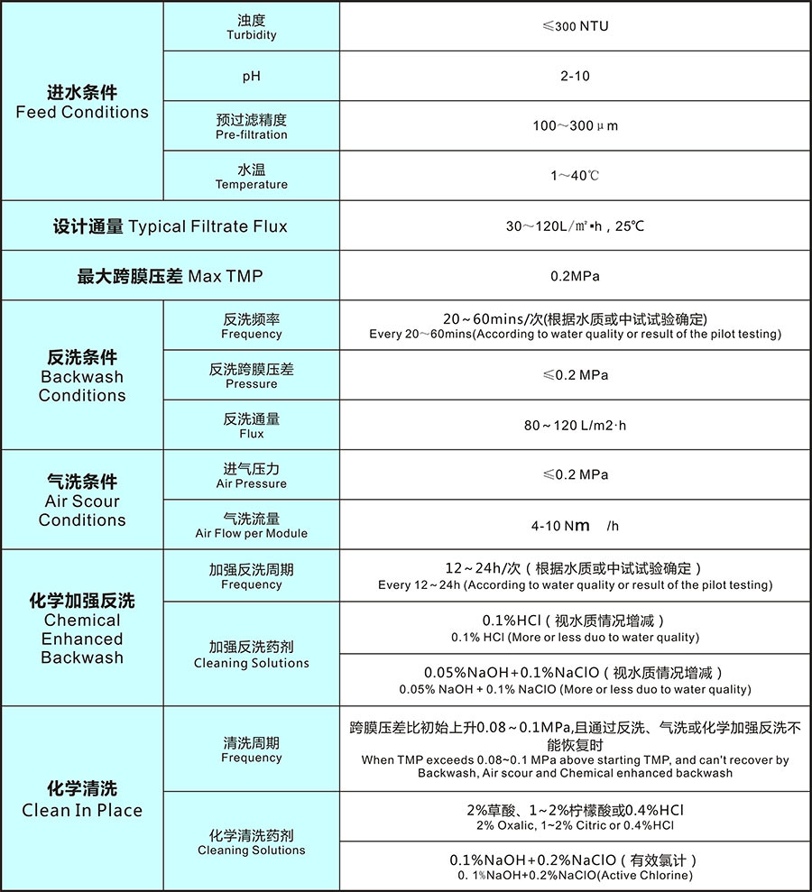产品特点: PVDF材质-耐氧化性药剂清洗 过滤精度高-产水水质好 先进的改性技术-抗污染性强 外压式结构-水质使用范围广 膜丝强度高-不易断丝
